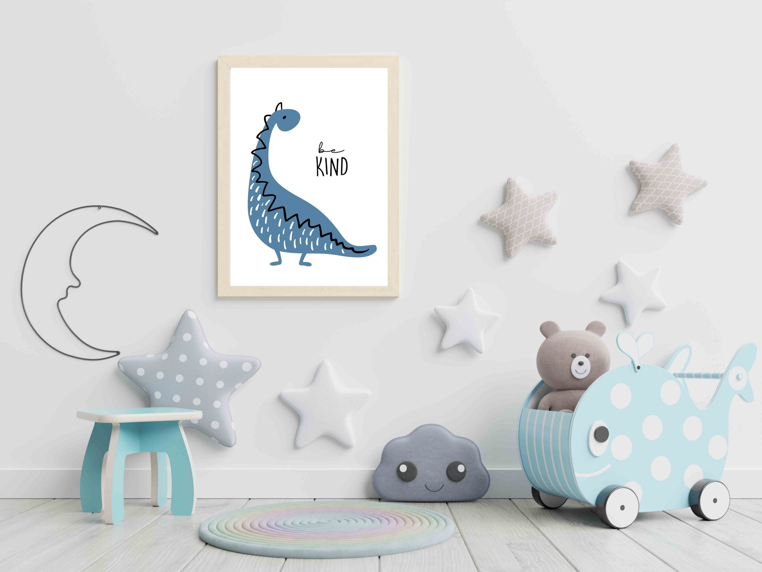 Grafika Dinozaver Be kind s pomembnim sporočilom bo najlepše popestrila sobico ali otroški kotiček in bo všeč vsem fantkom.